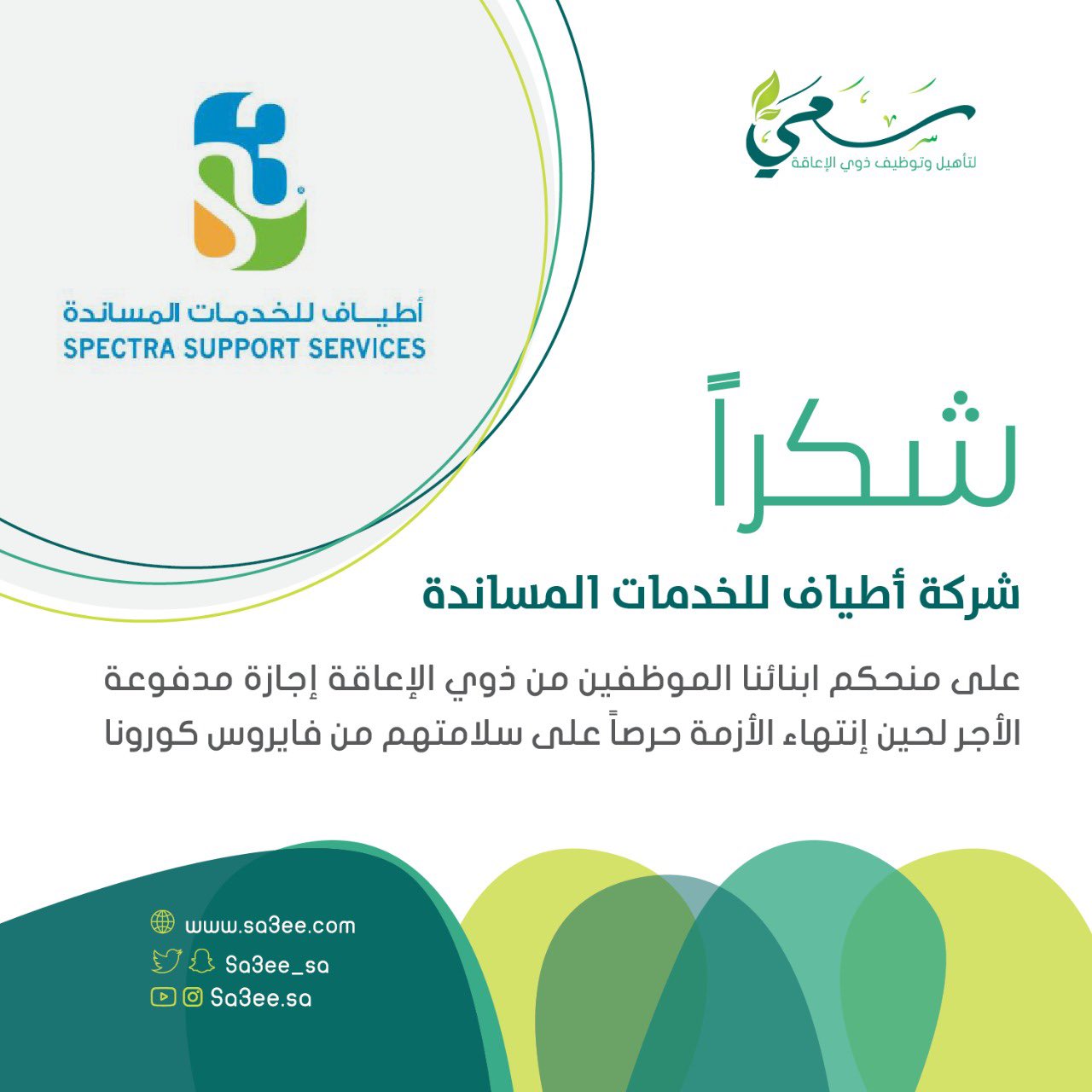 سعي On Twitter تتقدم سعي بالشكر لـ شركة اطياف للخدمات المساندةاطيا على منحها إجازة مدفوعة الأجر لحين إنتهاء الأزمة للموظفين لديها من ذوي الإعاقة كارونا السعودية الموارد البشرية والتنمية الاجتماعية Https T Co R1m3q8ngax