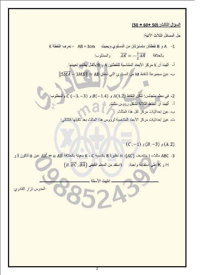اسئلة المذاكرة الأولي في الرياضيات للصف الحادي عشر الفصل الاول